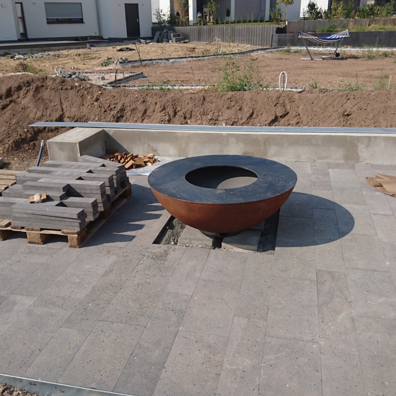 Die Wege und Zufahrt sind mit einem Belag aus eigens zugeschnittenen Basaltlavawerksteinen ausgeführt. Eine großzügige, repräsentative Holzterrasse am Haus bietet Platz für alles. Die Feuerstelle mit Sitzbank lädt zum zünftigen Grillabend. Eine von Schilf umgebene Gartendusche bietet Erfrischung im Sommer. Ein weiterer Sitzplatz hinten im Garten lädt zur Entspannung.
