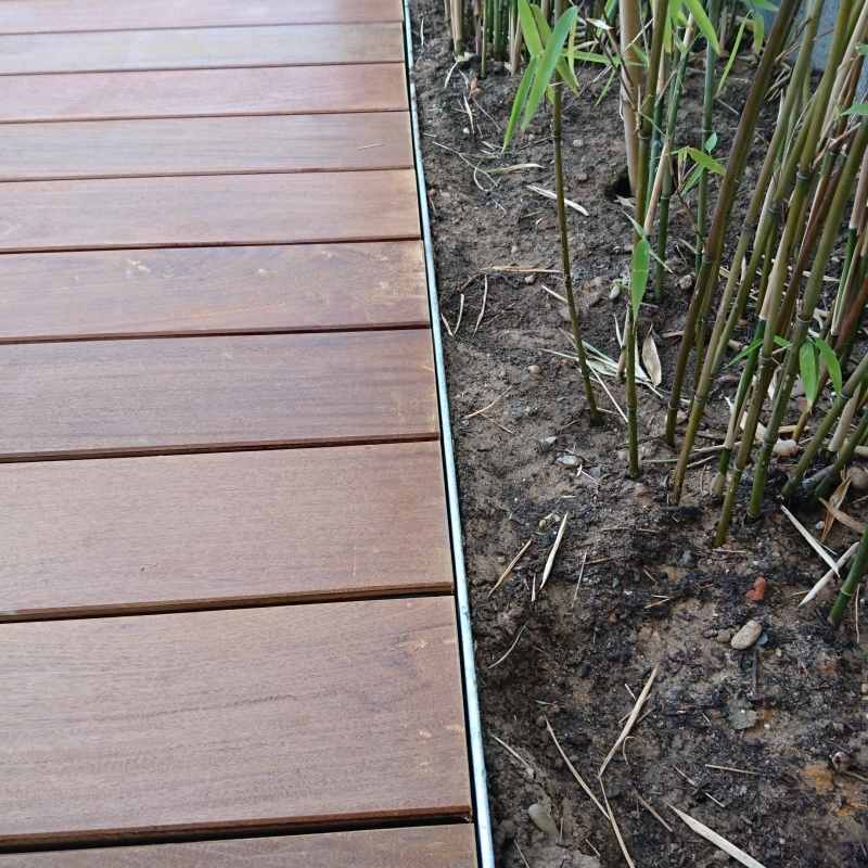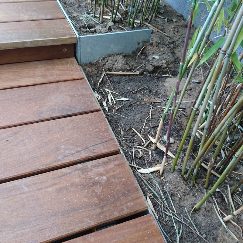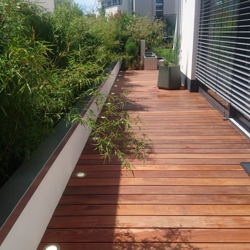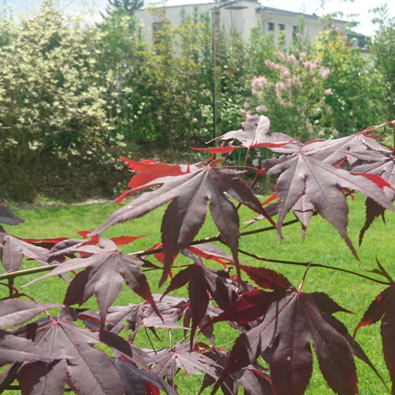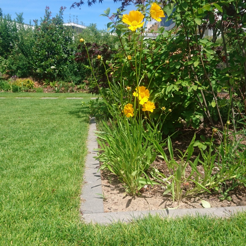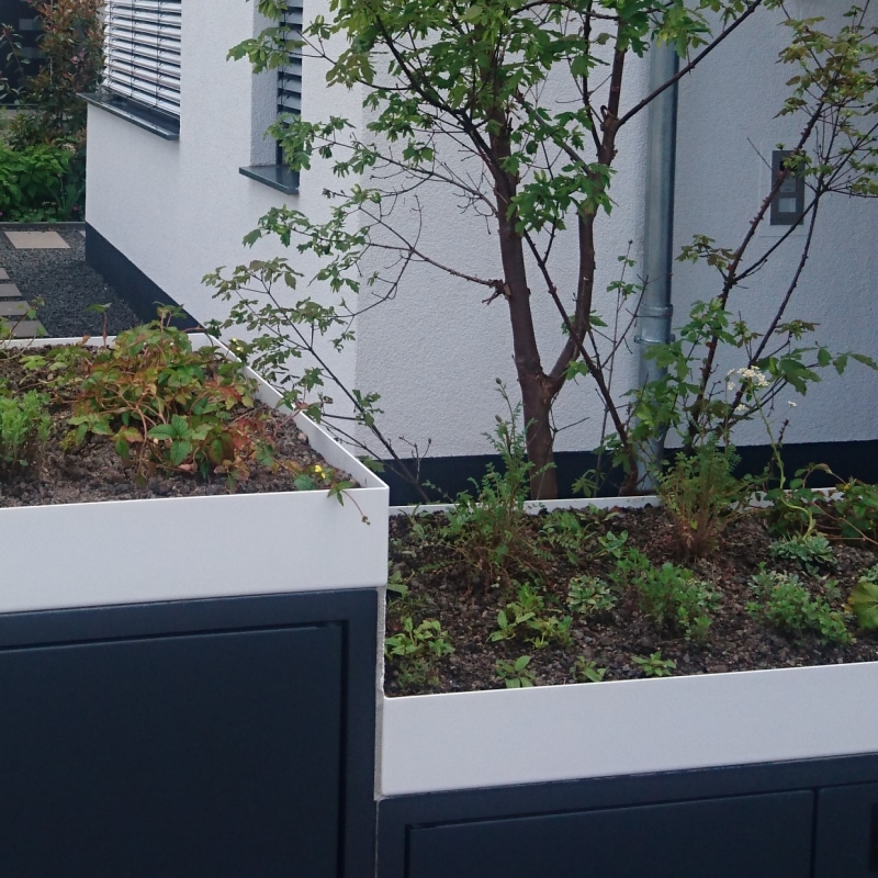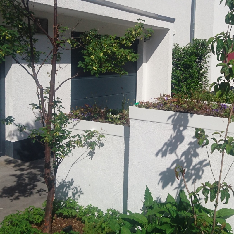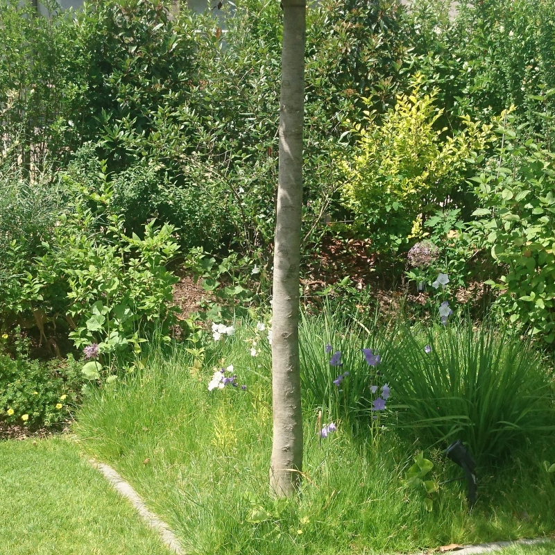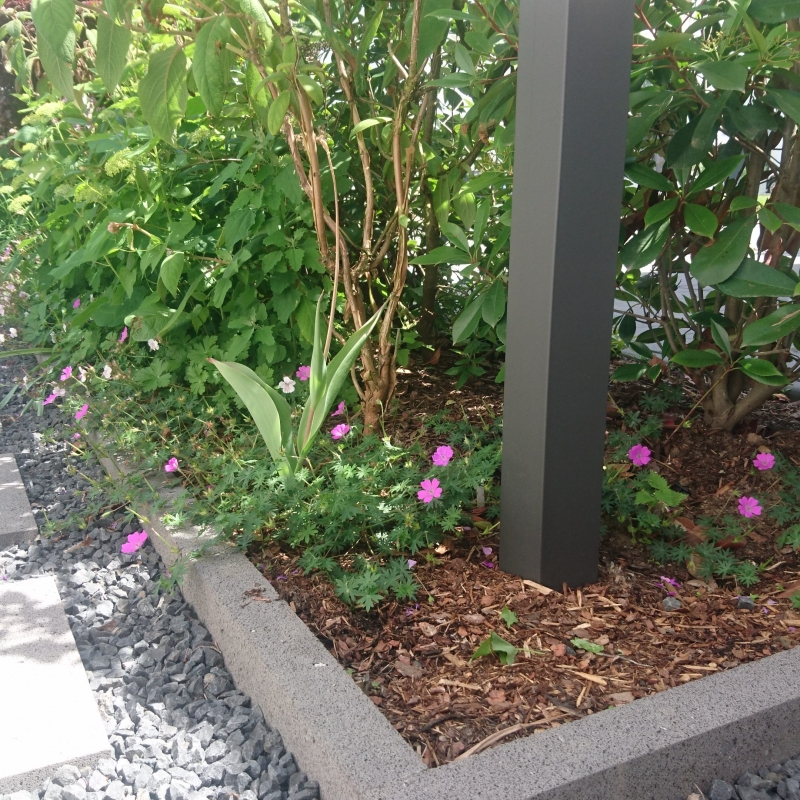 Die Bepflanzung ist einerseits funktional: Eine Pflanzengemeinschaft, ausgewählt nach Standortbedingungen bleibt über Jahre hinweg besonders pflegeleicht und bietet Sichtschutz. Licht- und Schattenspiel, üppige Blütenpracht laden andererseits ein zum Verweilen und Entspannen. Das Potpourri besteht aus saisonal blühenden Gehözen und Stauden.