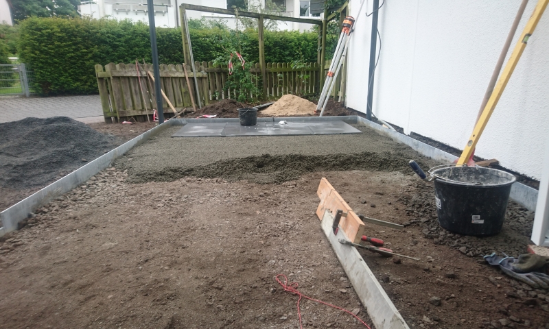 Im Rahmen der baulichen Veränderung des Wohnhauses war eine Vitalisierung des Hausgartens erwünscht. Im ersten Bauabschnitt wurde nun die Terrasse unter der neuen Bedachung realisiert.