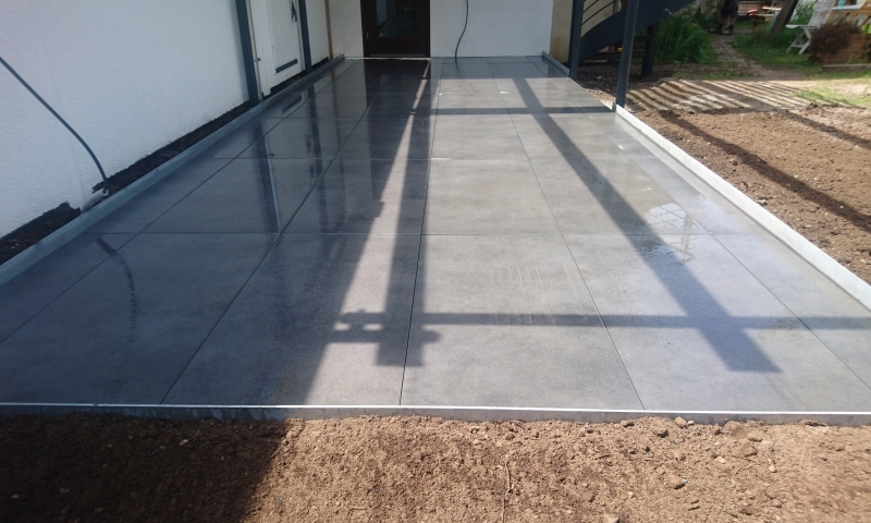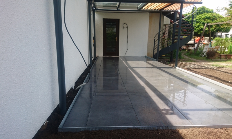 Als Einfassung der Terrassse kam ein verzinktes Stahlband zum Einsatz. Der Terrassenbelag wurde aus großformatigen, keramischen Platten auf Drainageestrich errichtet.